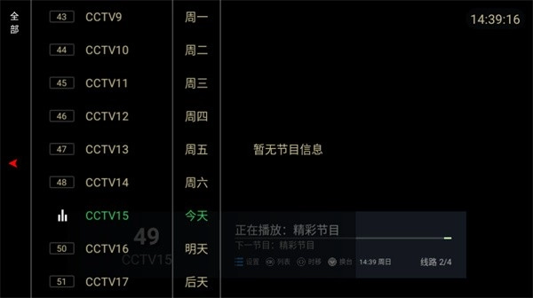 目录:CCTV1至CCTV15,CCTV5+,CCTV风云足球频道,CCTV高尔夫网球频道,CCTV世界地理频道,CCTV风云音乐频道,CCTV第一剧场频道,CCTV怀旧剧场频道,CCTV国防军事频道;湖南卫视、浙江卫视、东方卫视、江苏卫视、辽宁卫视。