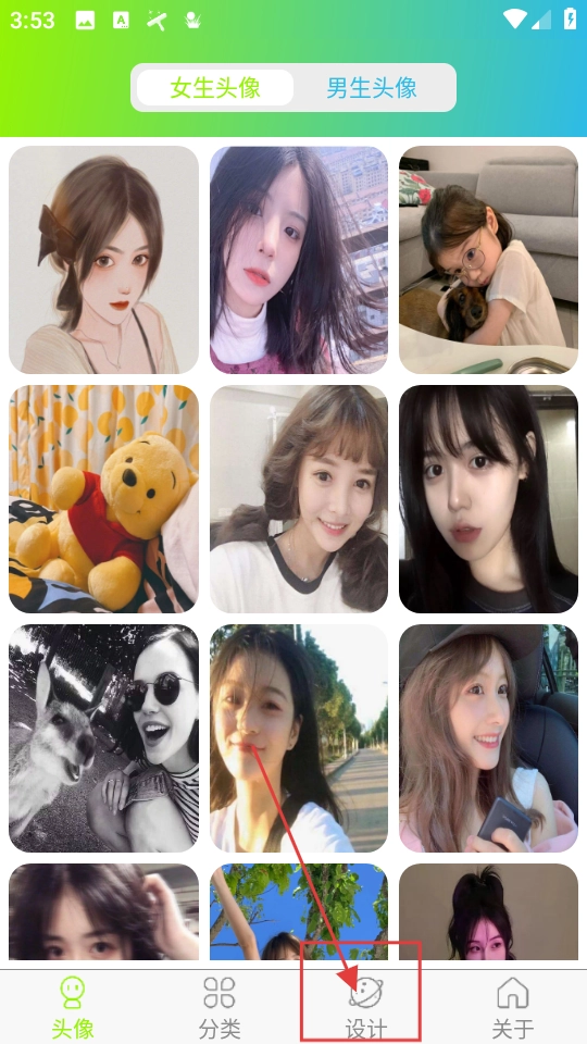 3、有头像浏览分类,设计页可点击生成头像,可保存及分享成果。