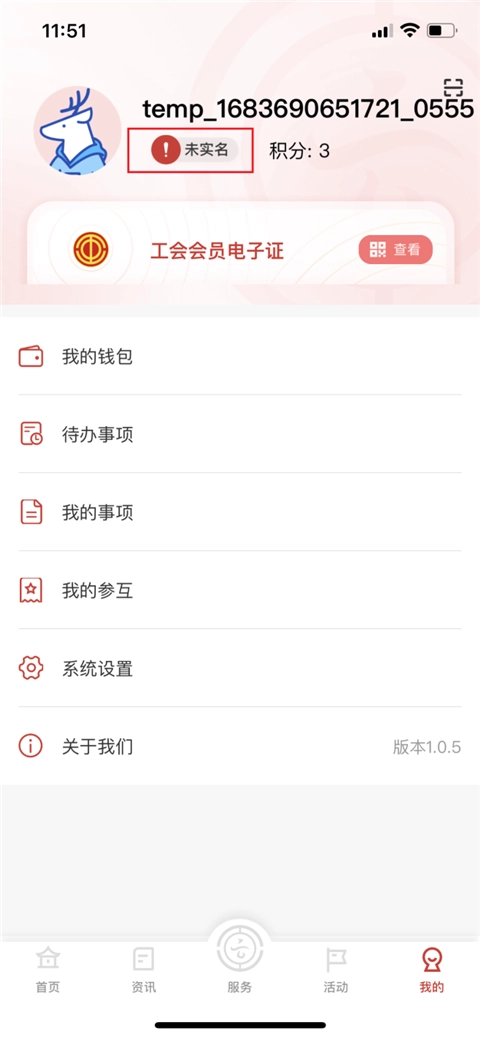 打开云岭职工应用,进入应用后,需进入“我的”页面,点击“未实名”选项来完成实名认证操作。