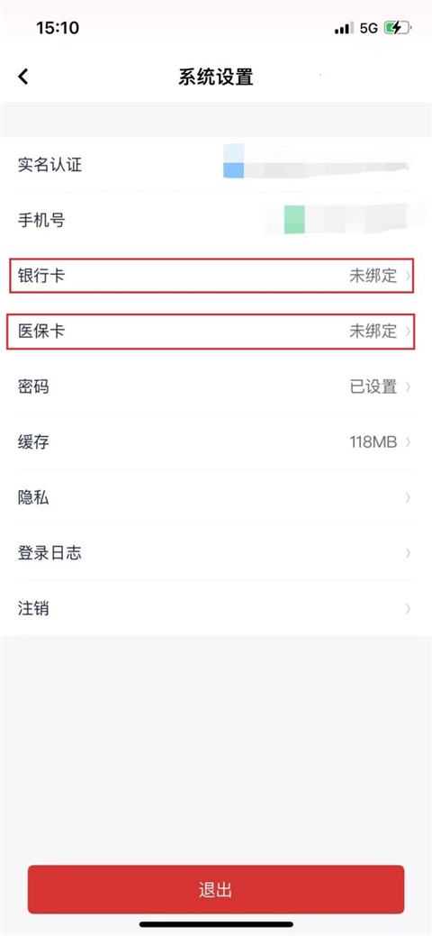 完成实名认证后,进入系统设置页面,点击绑定对应的银行卡和医保卡。