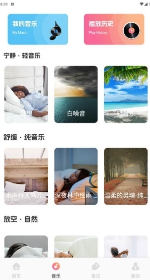 进入音乐页面后,你可以根据喜好挑选冥想引导、白噪音、纯音乐或是自然音效等不同类别的音频,这里支持一键播放功能,同时还能查看过往的播放记录,方便你重复收听那些喜欢的助眠内容。