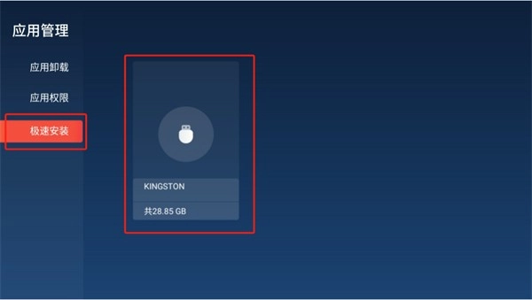 在电视卫士里,依次点击【应用管理】-【极速安装】选项,然后选择U盘。