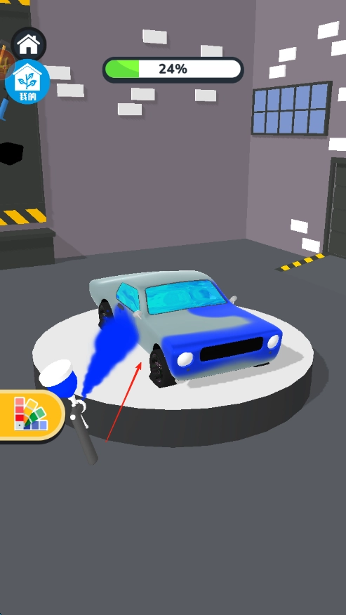 2、轻触喷漆按钮并长按,开始对汽车进行喷涂作业,此时屏幕上方会出现进度条,用以展示喷涂的完成程度。请持续该操作,直至车身涂鸦全部完成。