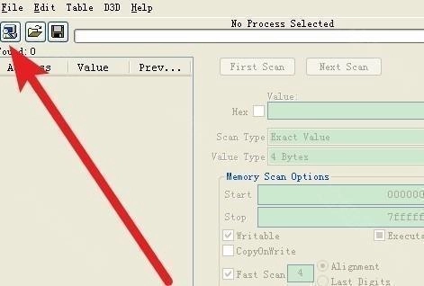打开CheatEngine汉化版,点击界面上那个小电脑样式的图标(位置如示例图所示)。