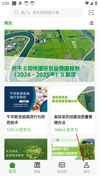 在田课首页,点击右下角我的选项,进入个人页面。