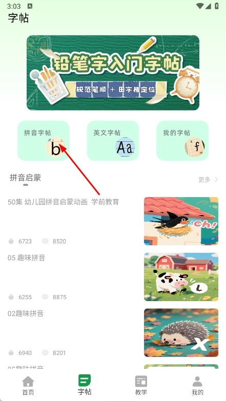 1. 开启汉语拼音发音点读软件,点击软件底部的字帖选项,从而进入字帖页面。