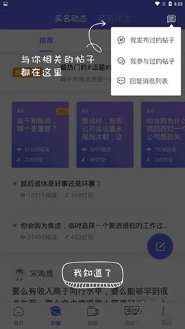 职圈就像一个小型的职场交流社区论坛,里面的内容都和职场、工作有关,在右上角还能查看和我相关的内容。