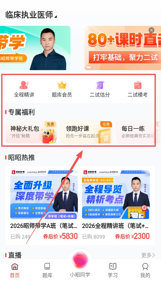 首页汇聚了各类学习资源,顶部导航栏支持切换临床执业医师等不同课程,也能通过参与免费活动来领取学习资料。