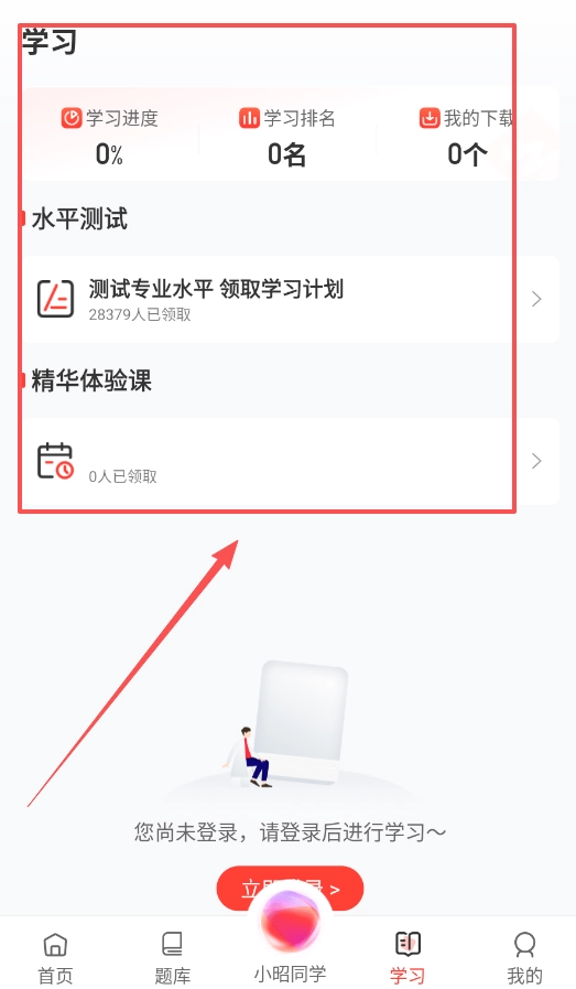学习页面会清晰呈现你的进度与排名情况;若未登录,则会显示登录提示。你可以据此合理规划后续的复习安排,让备考过程更具条理。