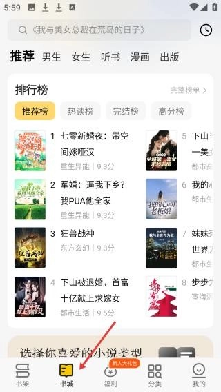 2、点击书城页,设推荐、男生、女生等频道,有排行榜展示热门小说,方便发现新书。