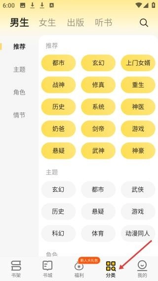 3、点击分类页,划分都市、玄幻等丰富类型,按主题、角色、情节细分,助用户精准找书。