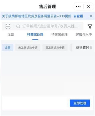 在售后管理列表中,选中需要退款的订单,然后点击“立即处理”按钮。