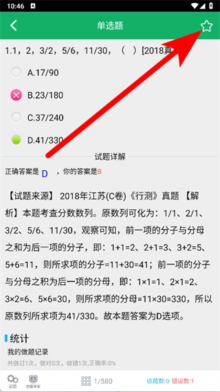 点击单选题的题目即可开始答题,点击右上角的星形图标就能收藏该题目。
