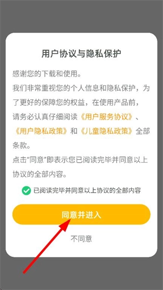 在用户协议和隐私保护的弹窗里,点击同意并进入,即可进入软件。