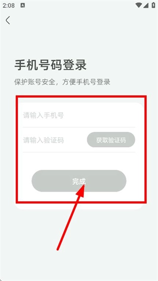 在手机号登录界面,输入手机号码与验证码,点击“完成”按钮,即可完成登录流程。