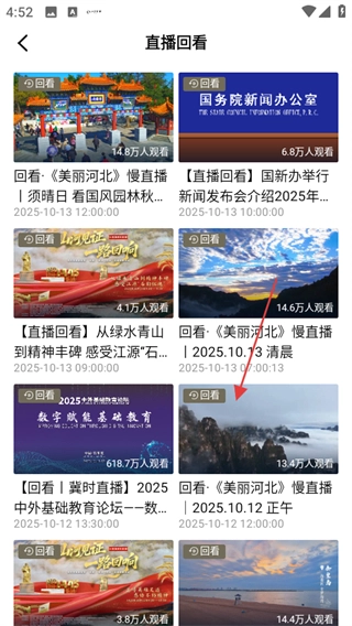 在直播回看列表页面,挑选你想要观看的直播回看内容,点击后进入对应的播放页面。