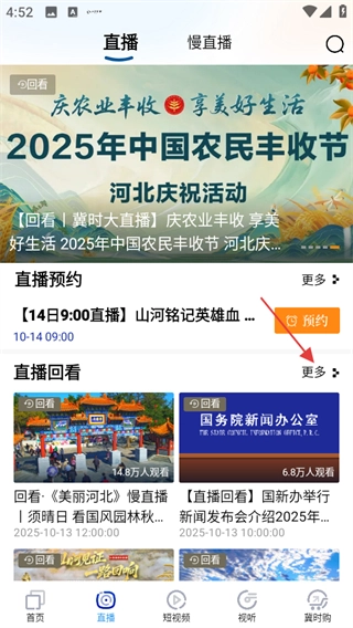 在直播页面,找到直播回看区域,点击其右侧的“更多”按钮,即可进入直播回看列表页面。