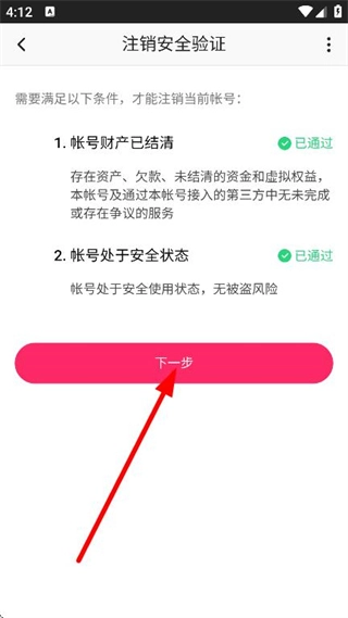 在账号注销的安全验证页面,当所有条件都满足后,点击“下一步”按钮,即可执行账号注销的相关操作。