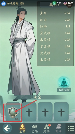 当处于【练气前期-13%】的阶段时,建议先装备【1级法宝】,这样能够快速提升基础属性,为前期的战斗和修炼提供助力。