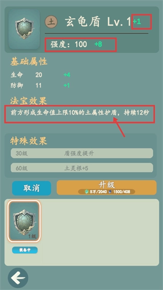 【玄龟盾-Lv.1+1】可为修士提供【相当于自身生命值上限10%的土属性护盾】,随着法宝等级提升,其防御能力还能进一步增强,是防御型修士不可或缺的核心法宝。