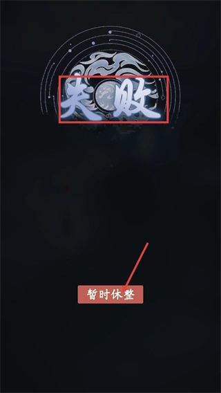 战斗中出现【失败】提示后,点击【暂时休整】,即可返回界面强化属性或法宝,待实力提升后再进行挑战。