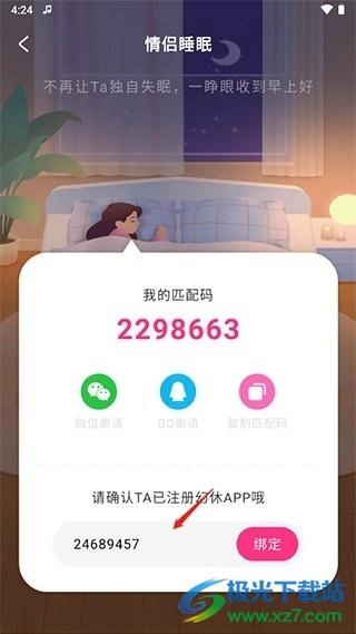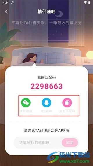 选择情侣睡眠模式后,系统会生成一个匹配码,你可以把这个匹配码发送给好友;要是觉得这种方法麻烦,也能通过下方的微信或QQ直接邀请对方。