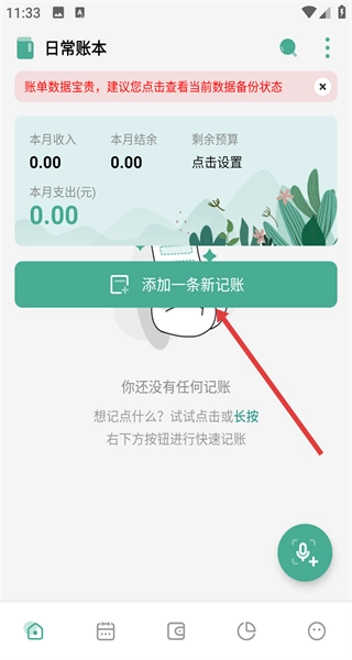进入日常账本界面后,点击添加新记账的按钮,就能启动记账流程,录入日常生活中的收支、预算结余等相关信息。