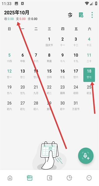 在日历界面切换到指定的日历页,选择2026年10月等具体月份,这样便于按日期管理记账内容,查看当月的收支结余情况。