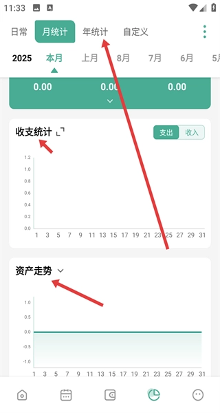 进入统计页面后,可通过年统计、月统计选项自主切换视图来查看收支统计情况,同时借助资产走势图表能轻松分析长期财务数据。