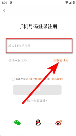 在登录注册页面,输入11位手机号码,然后点击获取验证码按钮。