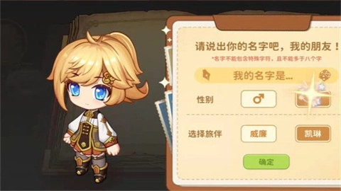 玩家第一次进入游戏时,要先输入角色名字,挑选一个伙伴,点击“确认”按钮就能正式进入游戏世界了。
