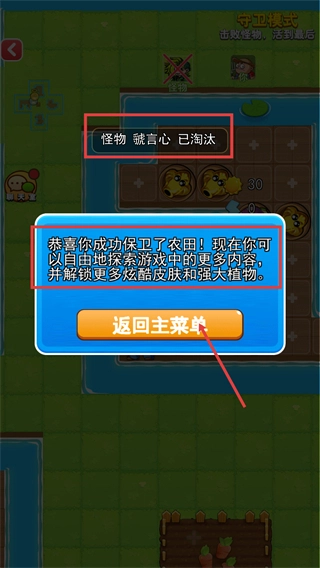 击败【怪物-虢言心】后会触发通关提示,届时可解锁更多游戏内容,点击【返回主菜单】即可准备进入下一轮挑战。