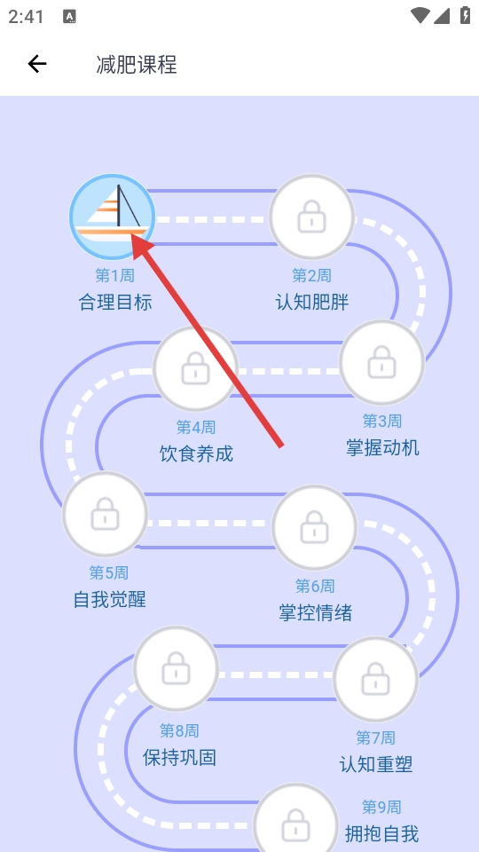 进入课程阶段页面后,请从【第1周-合理目标】起,依次完成各周课程的学习。