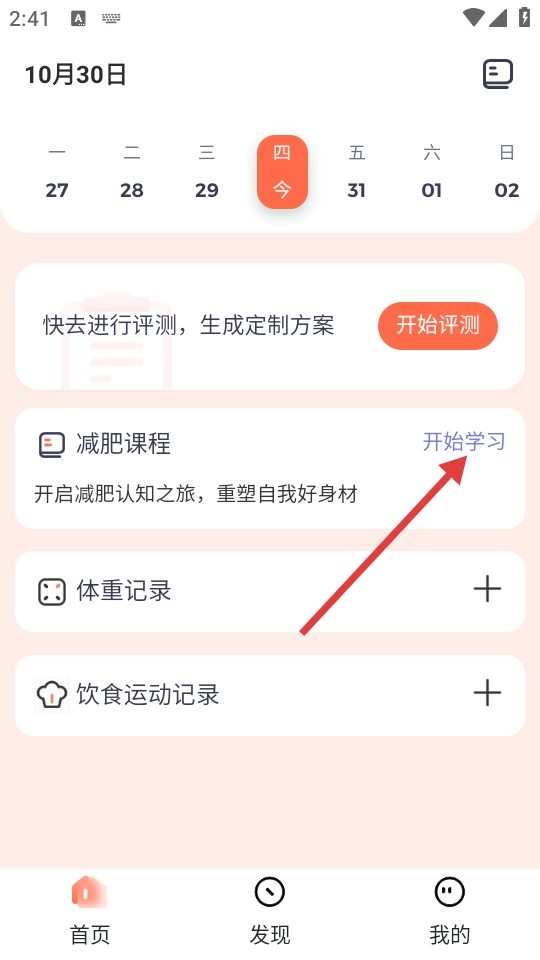 在首页中,点击【减肥课程】旁边的【开始学习】。