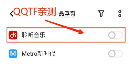 在悬浮窗设置界面中,开启用于聆听音乐功能的悬浮窗权限,然后重复执行步骤2的操作。