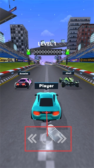 在【LEVEL1】赛车关卡里,你可以借助底部的【左右移动按钮】来调整蓝色赛车的赛道位置,躲开对手(Anselm、Aboli)的阻拦,以此推进比赛的进程。