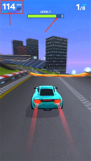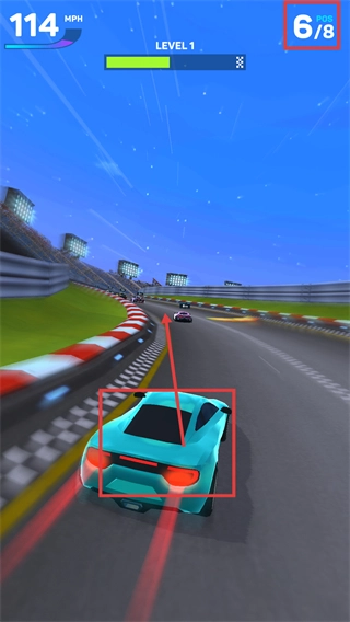 持续操控赛车超越剩余对手,将排名提升至【1/8】,同时推进关卡进度条向终点靠近。