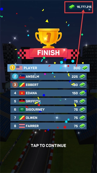 冲过终点后获得了【第1名】,成功领取了【300金币】的奖励,目前总金币已累计到【16,777,215】,点击界面就能继续挑战后续关卡。