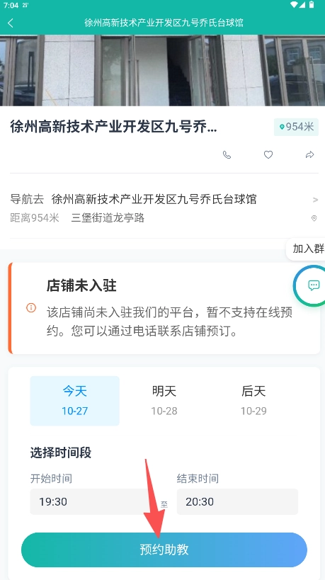 进入球馆详情页面查看相关提示,如果提示显示“店铺未入驻”,就需要通过电话联系,并点击“预约助教”按钮。