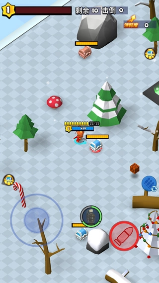 进入战场后,蓝色方向盘用于操控角色移动,点击红色按钮即可发射子弹发起攻击,蓝色血条代表自身,红色血条则对应敌人。