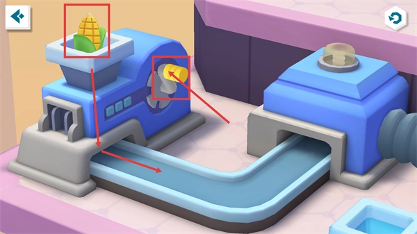 把【玉米】放进加工设备里,开启设备后就会生成相应的食材,经过加工的食材会借助传送带运送至后续的制作流程。