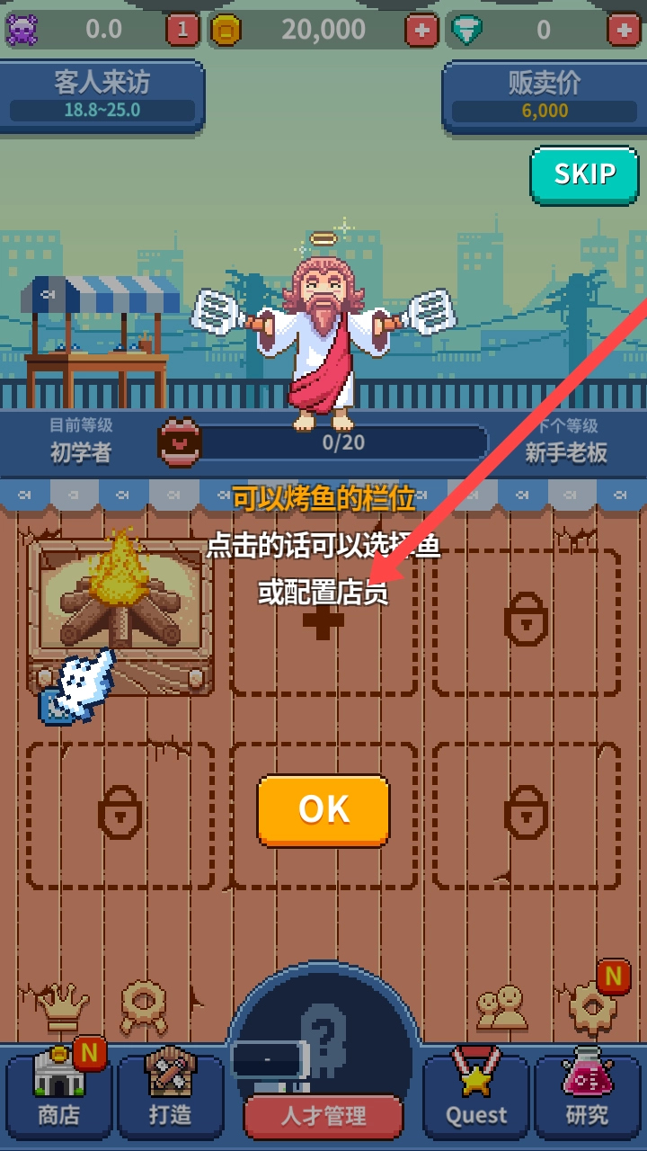 在“可用于烤鱼的栏位”这里,点击后选择鱼类来烤制,也能设置店员帮忙打理经营。等操作都完成了,就点击“OK”按钮确认。
