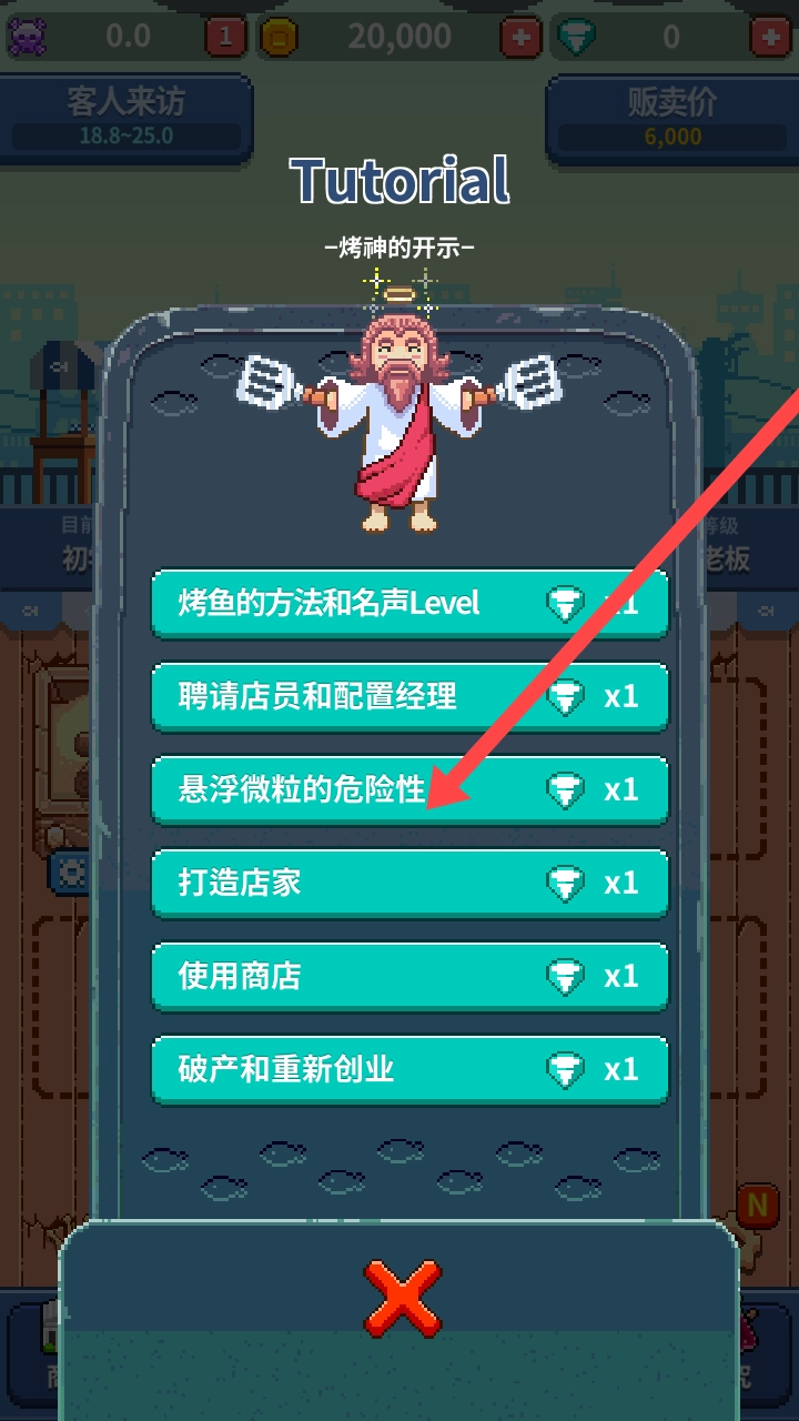 通过“Tutorial”教程,学习“烤鱼的方法和名声等级”“聘请店员与配置经理”等内容,以提升经营能力。