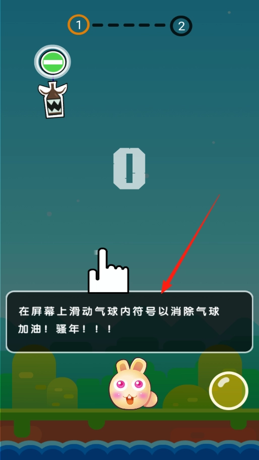 第一关开始时,会有操作提示引导你:通过在屏幕上滑动气球内的符号来消除气球,你需要用手指滑动对应的符号,把气球消掉以保护下方的小兔子,避免气球砸到它。