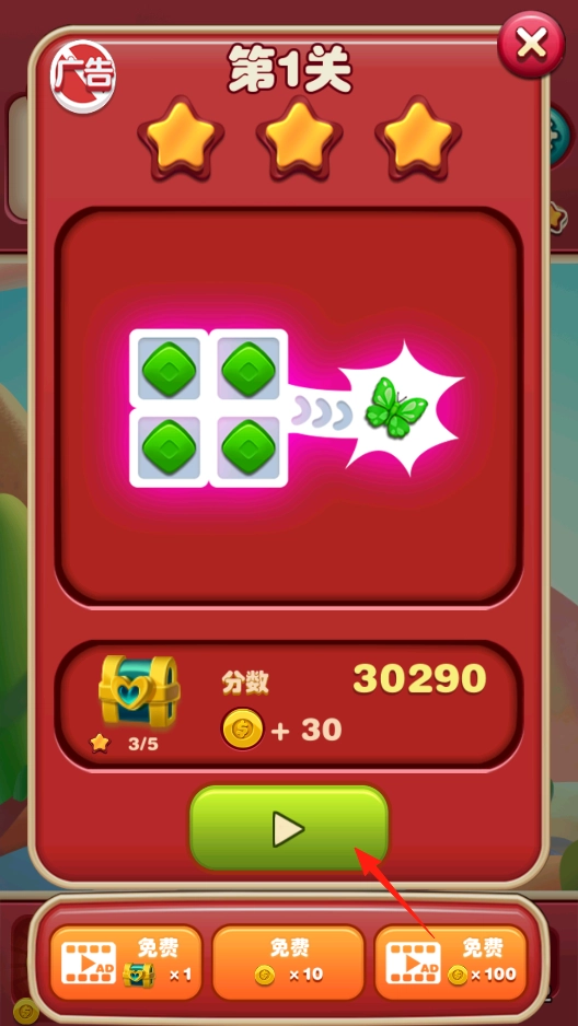 第一关通过后,界面会展示你的得分和对应的奖励。要是还想再玩一次这关,点击播放按钮就能重新开始;要是想领取奖励,只需确认分数和金币已经到账,然后就可以继续挑战下一关,努力获取更多的星星和金币。