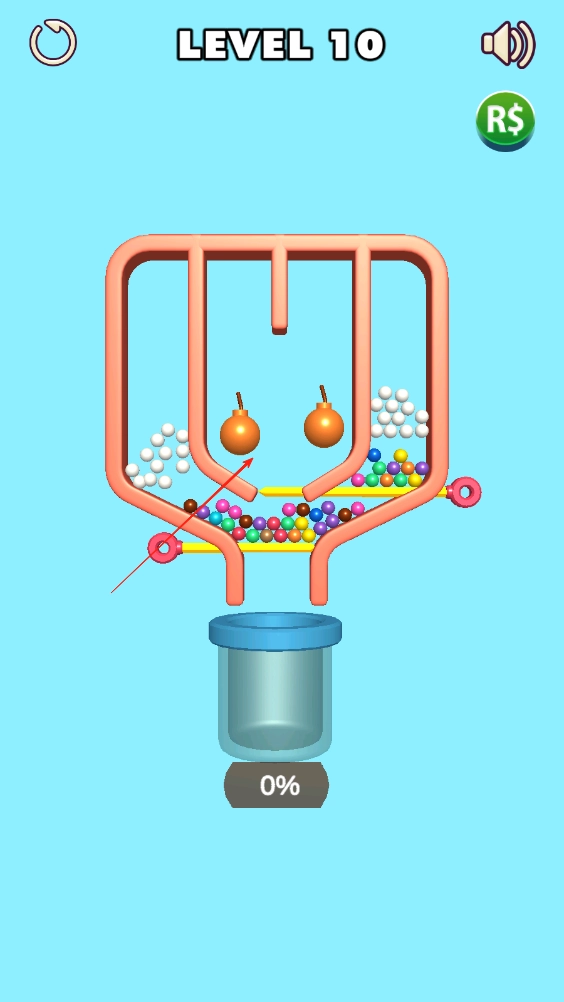 抽掉最上方的杆子后,掉落的东西里既有白色小球也有炸弹;要是炸弹从黑色变成橙色,就意味着它快要爆炸了,得赶在爆炸前让小球进到下面的玻璃杯里。