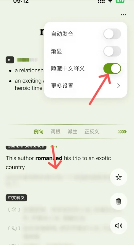 最后把这个功能的开关打开,就能成功隐藏所有单词的中文释义,进而专注于对英文本身的理解和记忆。