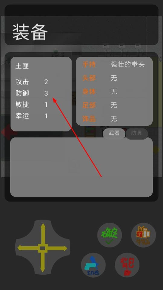 打开装备界面后,查看角色“土匪”的各项属性:攻击值为2,防御值为3,敏捷值为1,幸运值为1。该角色当前手持“强壮的拳头”作为武器,头部、身体等关键部位暂时没有穿戴任何防具。接下来需要结合这些属性特点,制定对应的战斗策略。