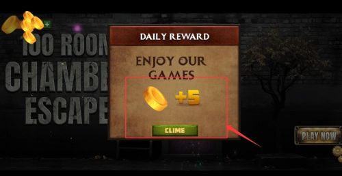 当“DAILY REWARD”界面弹出时,玩家能领取每日奖励(包含5枚金币),点击“CLAIM”按钮即可获得这些金币,它们可在后续的密室解谜过程中,用于购买道具、解锁提示等用途。