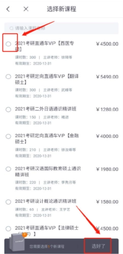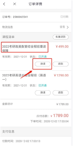 挑选需要办理退换课的订单,点击【进入订单页申请退换课】,若符合退换课规则,就能选择相应的课程,点击【换课】按钮;